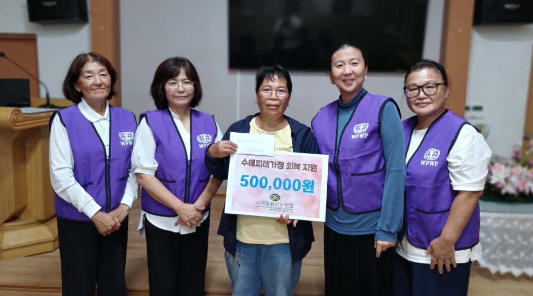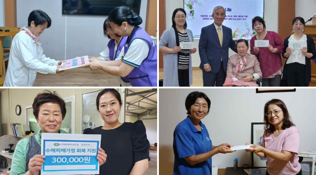 사단법인 세계평화여성연합(이하 여성연합)은 집중호우로 피해를 입은 가정을 돕기 위한 ‘지구가족사랑1%운동 수해피해가정 회복 지원’ 사업을 진행했다. 이번 지원을 통해 대전·충남(7가정), 전북(2가정), 광주·전남·제주(2가정), 경남(5가정) 등 전국 16가정에 총 9,800,000원이 전달되었다.